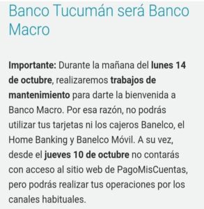 Desde el próximo martes el Banco Tucumán cambiará su nombre por el de Banco Macro, en el marco de la venta realizada por la Provincia de su paquete accionario al banquero Jorge Brito. Esto demandará algunos ajustes técnicos que restringirá ciertas operaciones, como sucederá el lunes 14, cuando no se podrá utilizar las tarjetas emitidas por la entidad ni los cajeros Banelco, el Home Banking y Banelco Móvil.