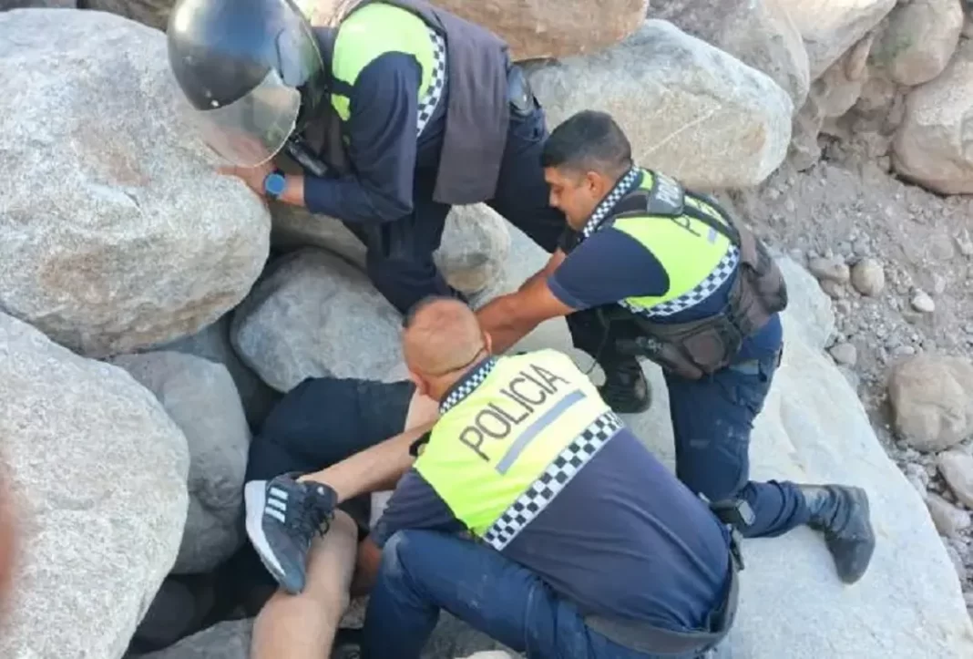 El insólito hecho se produjo en la zona de El Mollar, donde un joven quiso sacarse una selfie, se le cayó el celular, intentó recuperarlo y quedó atrapado. Fue auxiliado por la Policía.