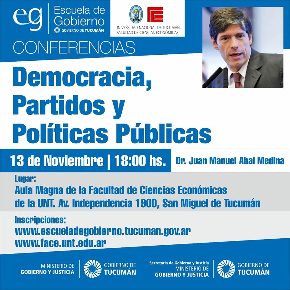 Será en el marco del lanzamiento de la carrera de Posgrado Especialización en Administración y Políticas Públicas, de la Facultad de Ciencias Económicas de la UNT. Serán dos Conferencias: por un lado, Juan Manuel Abal Medina, expondrá sobre “Democracia, Partidos y Políticas Públicas”. Por su parte, Diego Reynoso, disertará sobre “El espacio político de competencia, distribución del electorado y posicionamiento estratégico”.