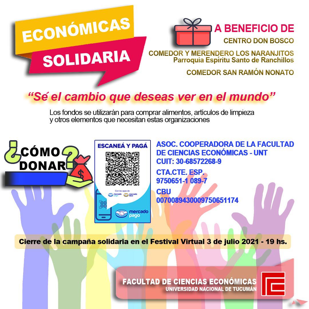 Lanzamos la campaña “Económicas Solidaria” con el objetivo de juntar donaciones que serán destinadas a tres comedores de nuestra provincia: El Centro Don Bosco, el Comedor y Merendero Los Naranjitos (Parroquia Espíritu Santo de Ranchillos) y la Parroquia San Ramón Nonato. Los fondos se utilizarán para comprar alimentos, artículos de limpieza y otros elementos que necesitan estas organizaciones.