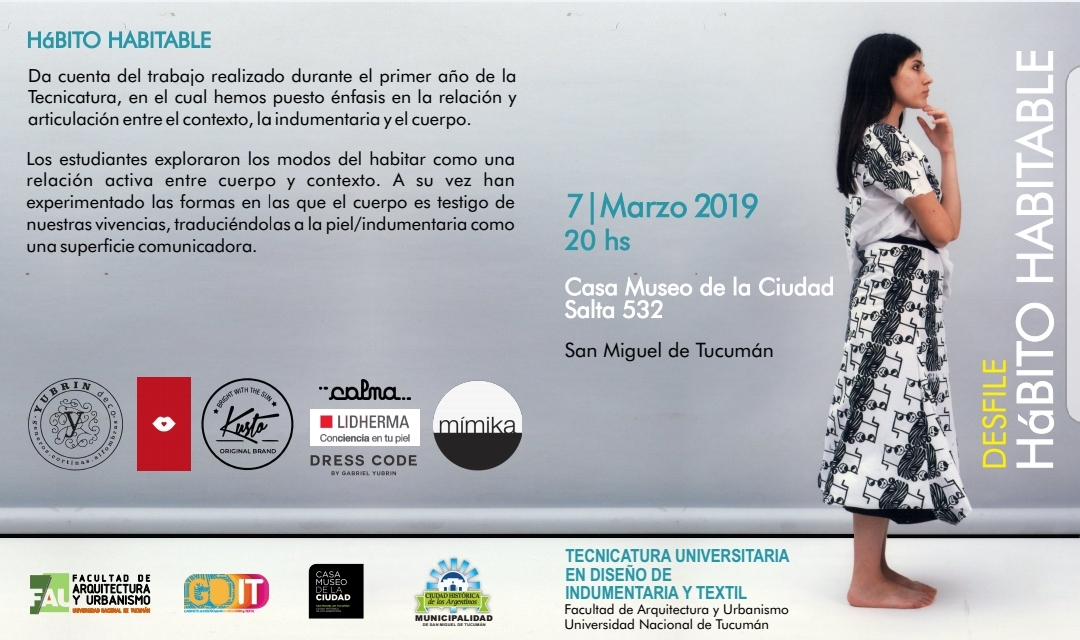 El jueves 7 de marzo, se llevará a cabo el desfile HÁBITO HABITABLE en la recientemente inaugurada Casa Museo de la Ciudad. A las 20, se llevará a cabo la presentación de los diversos trabajos que realizaron los alumnos durante la cursada del primer año.