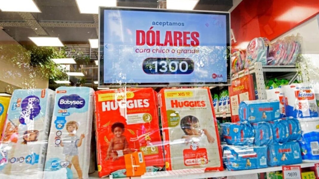 En San Martín al 700, una casa dedicada a la venta de productos de limpieza ya exhibe sus precios en dólares y acapara la atención de quienes llegan a comprar. “Aceptamos dólares cara chica o grande, $1.300”, anuncia un cartel electrónico del local: “Tenemos otras sucursales y allí también aplicamos la medida. La gente entra y pregunta, todavía no entienden”, comentó uno de los vendedores.