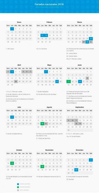 En 2018, son tres los feriados o días no laborables que caen martes o jueves. En el calendario para el año próximo, el 24 de abril (Día de acción por la tolerancia y el respeto entre los pueblos), el 1 de Mayo (Día del trabajador) y el 25 de diciembre (Navidad) caen martes y son fechas posibles para establecer un feriado puente.