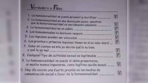 El cuestionario también menciona como “verdadero” que la homosexualidad es una desviación social, mientras que la heterosexualidad es “socialmente saludable”.