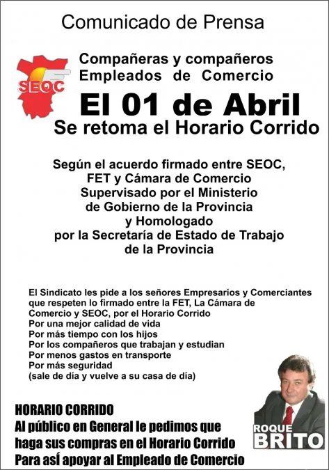 «El sindicato les pide a los señores Empresarios y Comerciantes que respeten lo firmado entre la FET, la Cámara de Comercio y SEOC por el horario corrido por una mejor calidad de vida, por más tiempo con los hijos, por los compañeros que trabajan y estudian, por menos gastos en transporte, por más seguridad (sale de día y vuelve a su casa de día)», dice el comunicado del gremio que nuclea a los empleados del comercio.