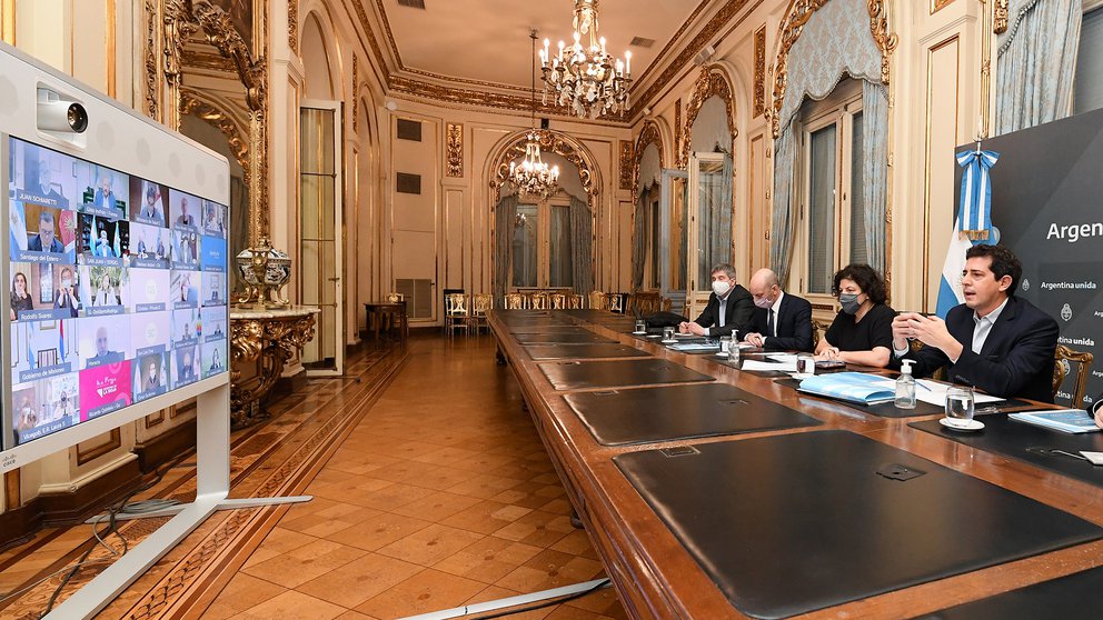 El ministro del Interior, Eduardo “Wado” De Pedro, y la ministra de Salud, Carla Vizzotti, encabezaron una videoconferencia con los 23 gobernadores y el jefe de Gobierno porteño, Horacio Rodríguez Larreta, para conocer el ritmo de vacunación en las provincias y explicar al detalle cómo es el proceso de compras de vacunas.